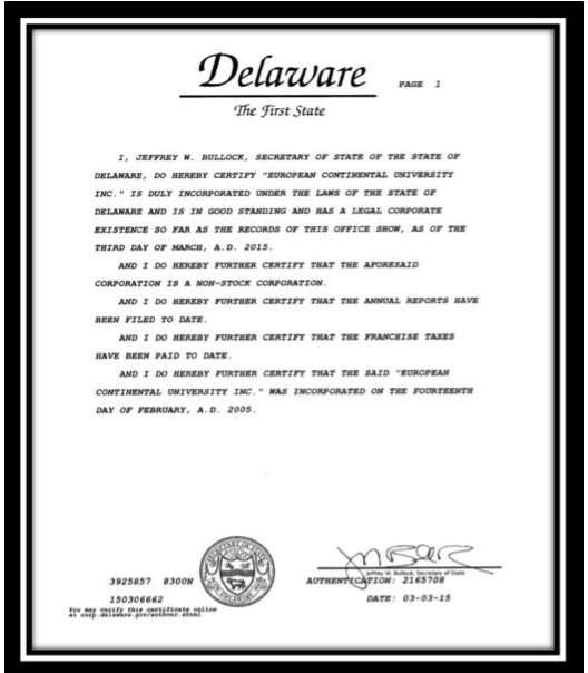 This specific above information is furnished by the Exacutive Board of Governors and Trustees of European Continental University of State of Delaware; USA is to emphasise the validity of acu’s awards to their prospective candidates. acu’s Professional Knowledge Qualification should be earned rather than paper award. It is also made aware to every applicant to understand the private university concept of USA, which various from state to state. The acu was sanction by the State Secretary of Delaware, who has the power to incorporate any corporation to be legitimately to be operated from his state. This has been fulfilled by the trustees of the acu as a NonDomicile Distance Learning, Non-Academic Private Knowledge University. This was declared at the time of incorporation.